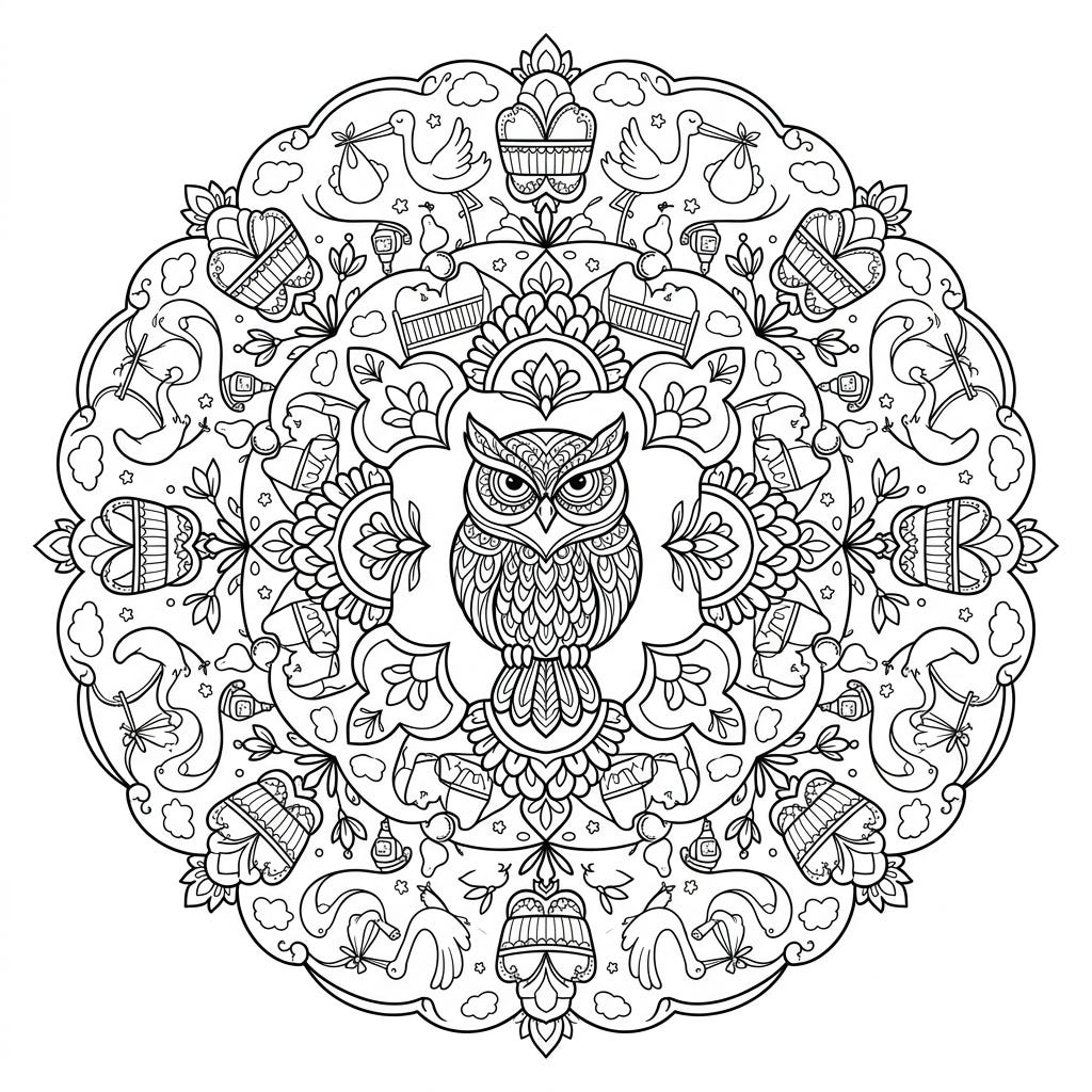 View coloring pageWelcome a new little one with this unique owl mandala, beautifully intertwining the wisdom of an owl with adorable baby shower themes. It's a perfect blend of intricate art and celebratory joy, ready for your creative touch.