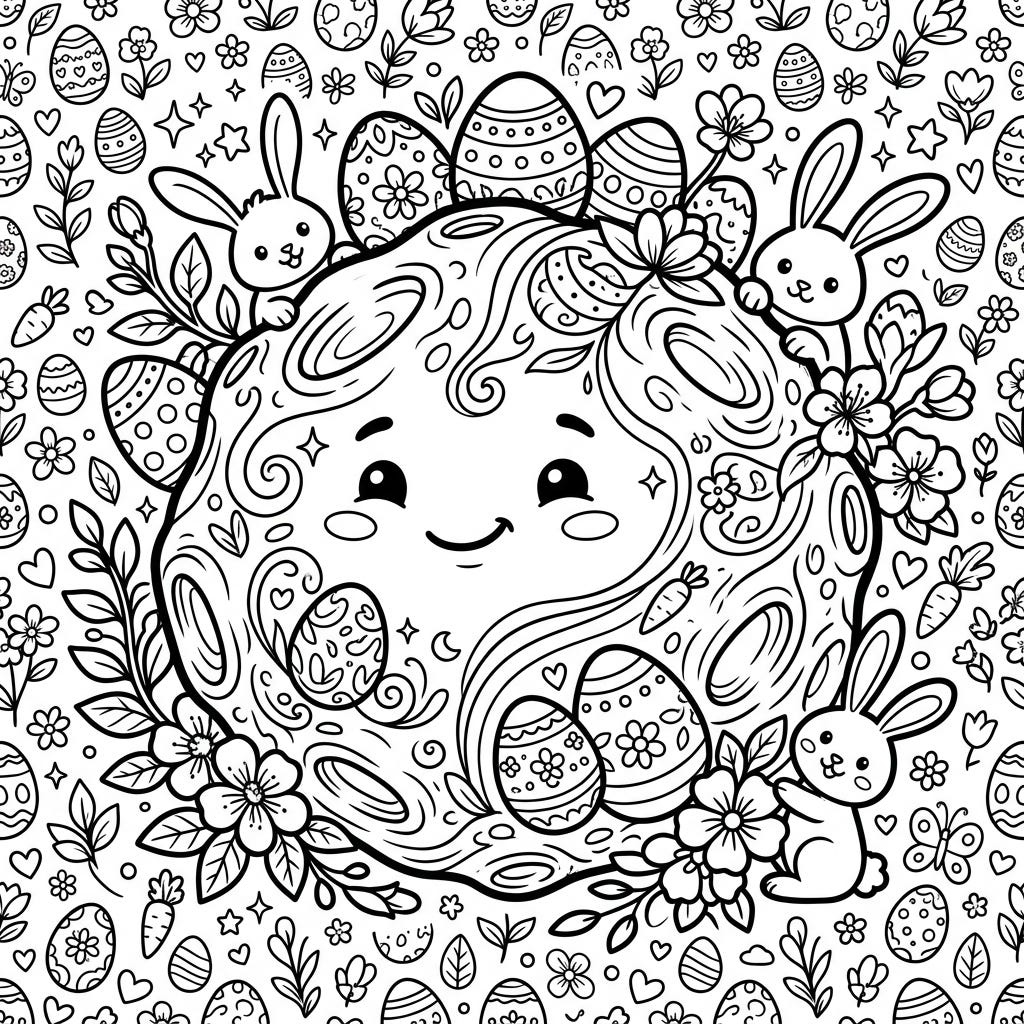 Discover a delightful coloring adventure with our Hygiea Asteroid Easter celebration page, where the celestial meets springtime joy. This charming design features a smiling asteroid surrounded by playful bunnies, decorated eggs, and blooming flowers, perfect for all ages.