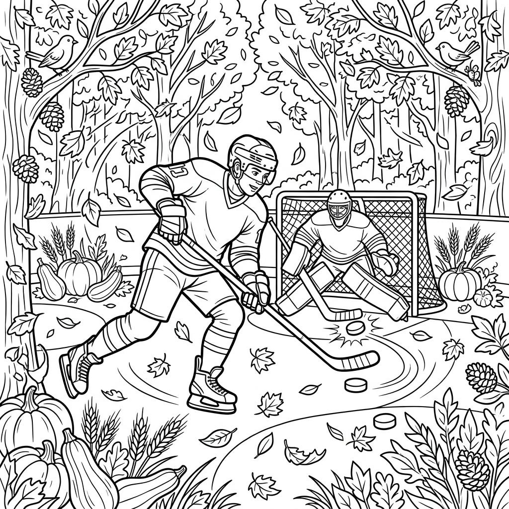 Experience the thrill of ice hockey combined with the beauty of autumn in this dynamic coloring page. Skaters and goalies take to the rink surrounded by falling leaves and festive harvest decor.