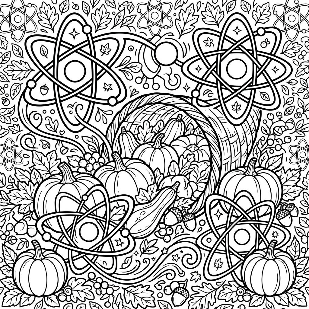 Delve into a truly unique coloring experience where the bounty of Thanksgiving meets the marvels of atomic science. This captivating page combines traditional harvest symbols with stylized oxygen atoms for an engaging creative challenge.