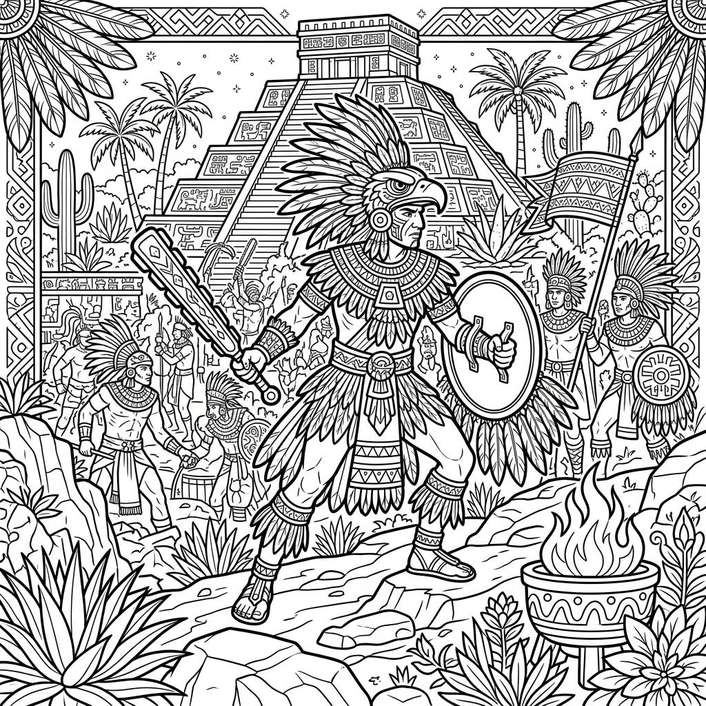 View coloring pageStep back in time to the heart of ancient Mesoamerica with this intricate coloring page featuring a powerful Aztec Eagle Warrior. This full-scene landscape invites you to bring an epic battle and a bustling historical world to life with your favorite colors.