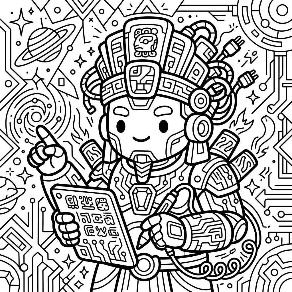 Dive into a vibrant universe with our Itzamná Kawaii Cyberpunk coloring page, where ancient Mayan divinity meets futuristic cuteness. This unique design features the cosmic deity reimagined with bold outlines and tech-inspired details, offering a truly engaging artistic experience.
