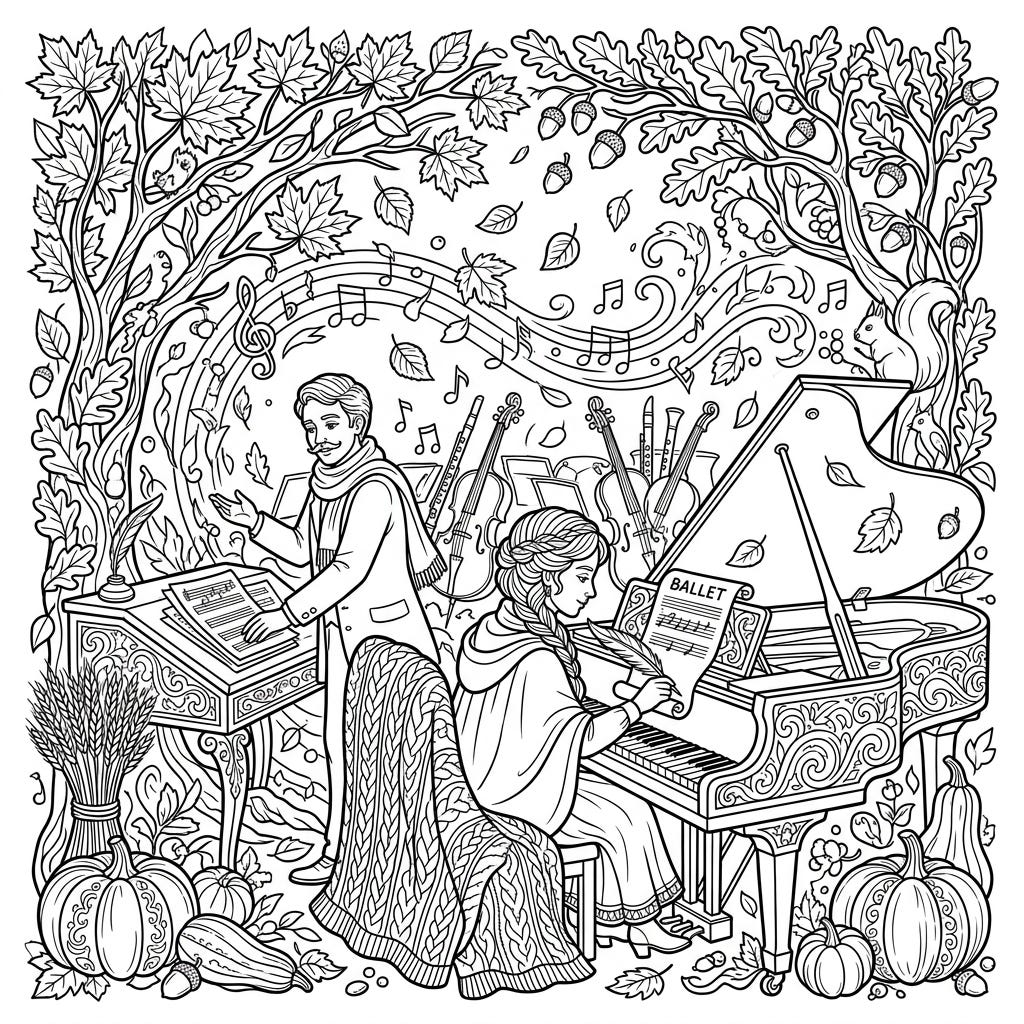 Celebrate the artistry of ballet composers set against a picturesque autumn backdrop in this captivating coloring page. Featuring rich fall details and musical elements, it's an inviting scene waiting for your colorful imagination.
