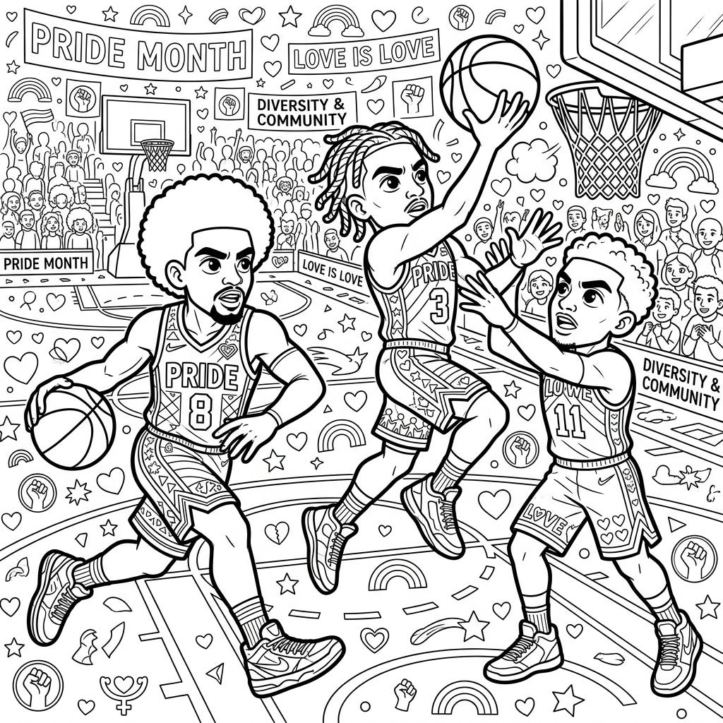 Get ready to celebrate Pride Month with this exciting coloring page featuring dynamic NBA point guards in action. Adorned with symbols of love and community, it's a perfect way to combine your passion for basketball and inclusivity.