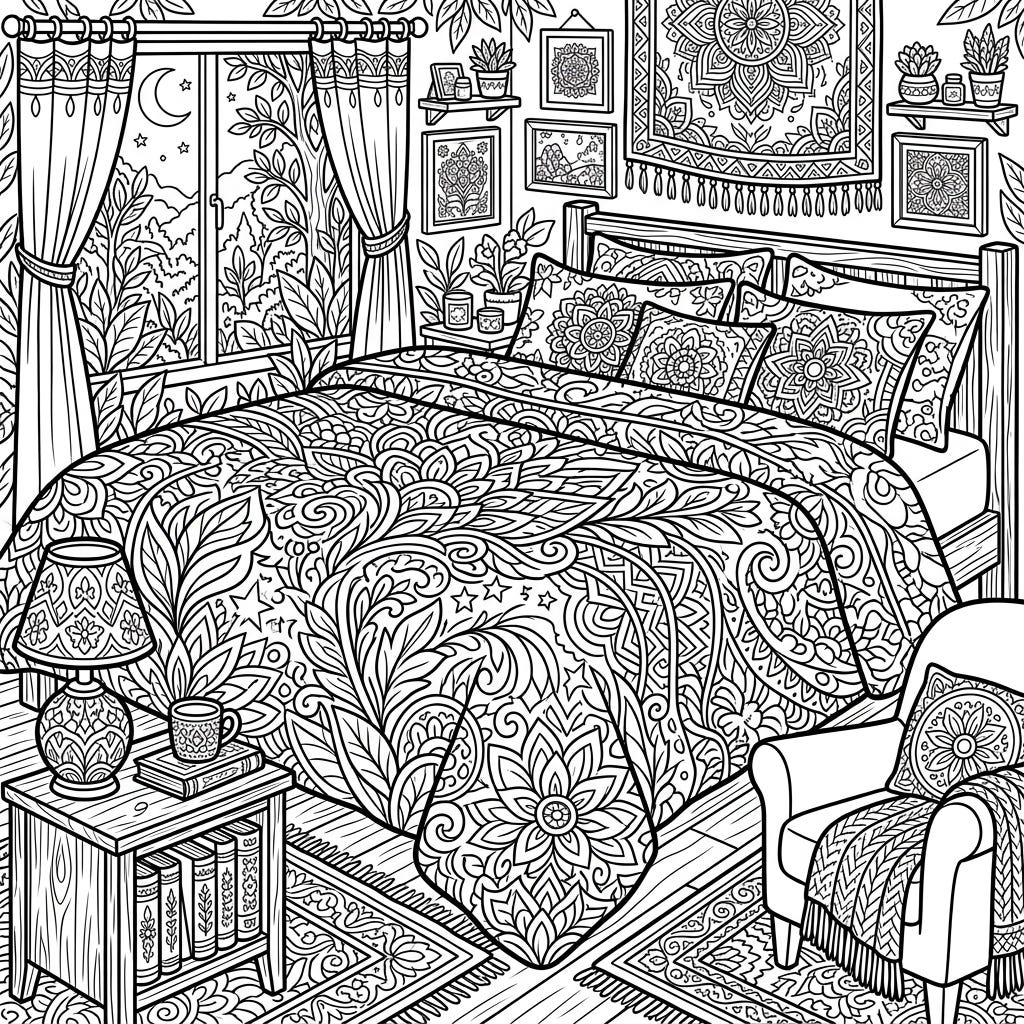 Discover a serene escape with this intricate full-scene coloring page, perfect for adults seeking relaxation. Dive into a beautifully detailed bedroom featuring a prominent, patterned duvet cover and charming bohemian decor.