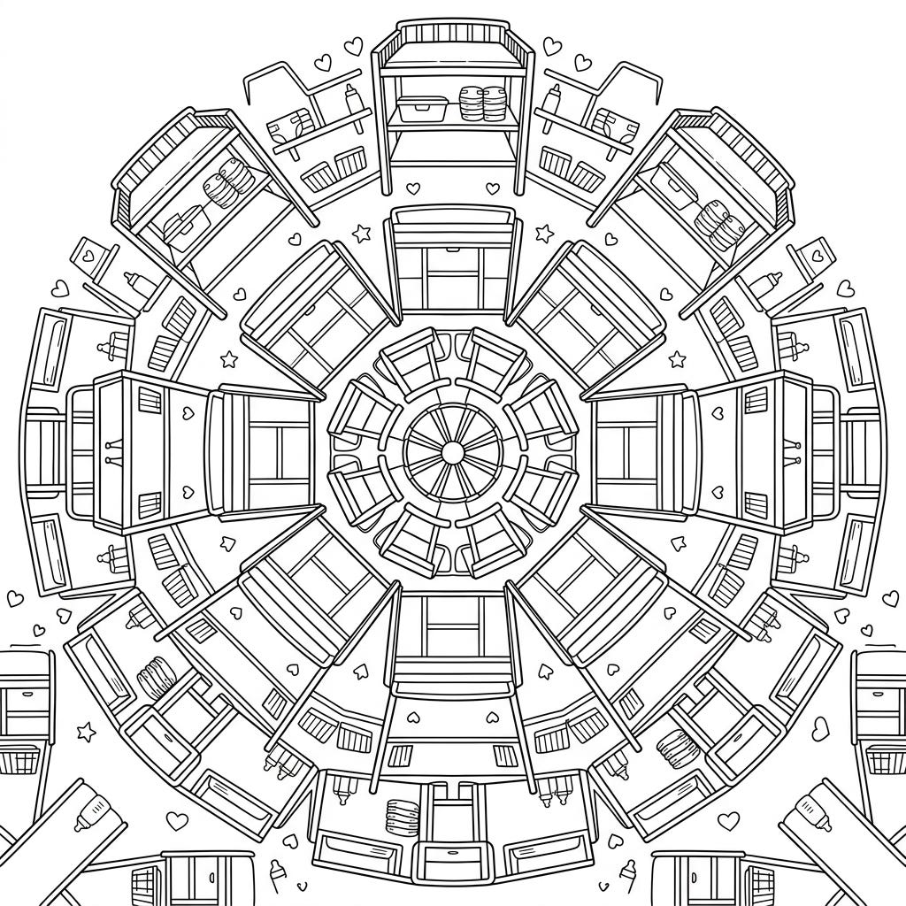 Dive into a wonderfully unique coloring experience with this intricate changing table mandala. This symmetrical design blends everyday nursery furniture into a calming, creative pattern, perfect for mindful coloring.