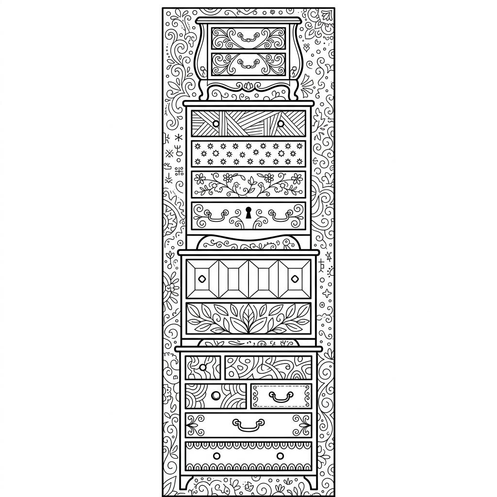 Discover a world of intricate designs with this unique chests of drawers bookmark coloring page. Each drawer offers a new pattern to bring to life with your favorite colors, making it a perfect creative escape.