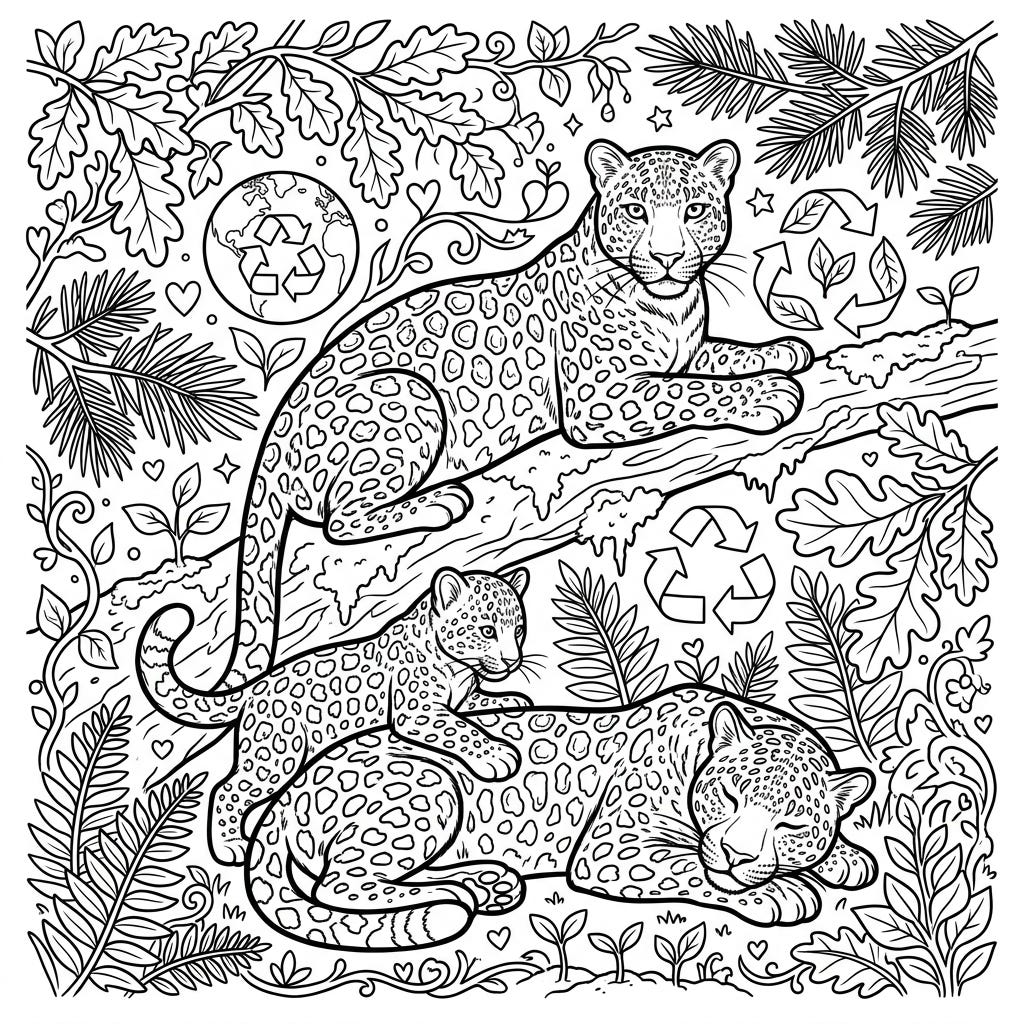 View coloring pageImmerse yourself in nature's beauty with this intricate Amur leopard coloring page, celebrating Earth Day. Featuring a loving leopard family alongside symbols of environmental care, it's perfect for all ages.