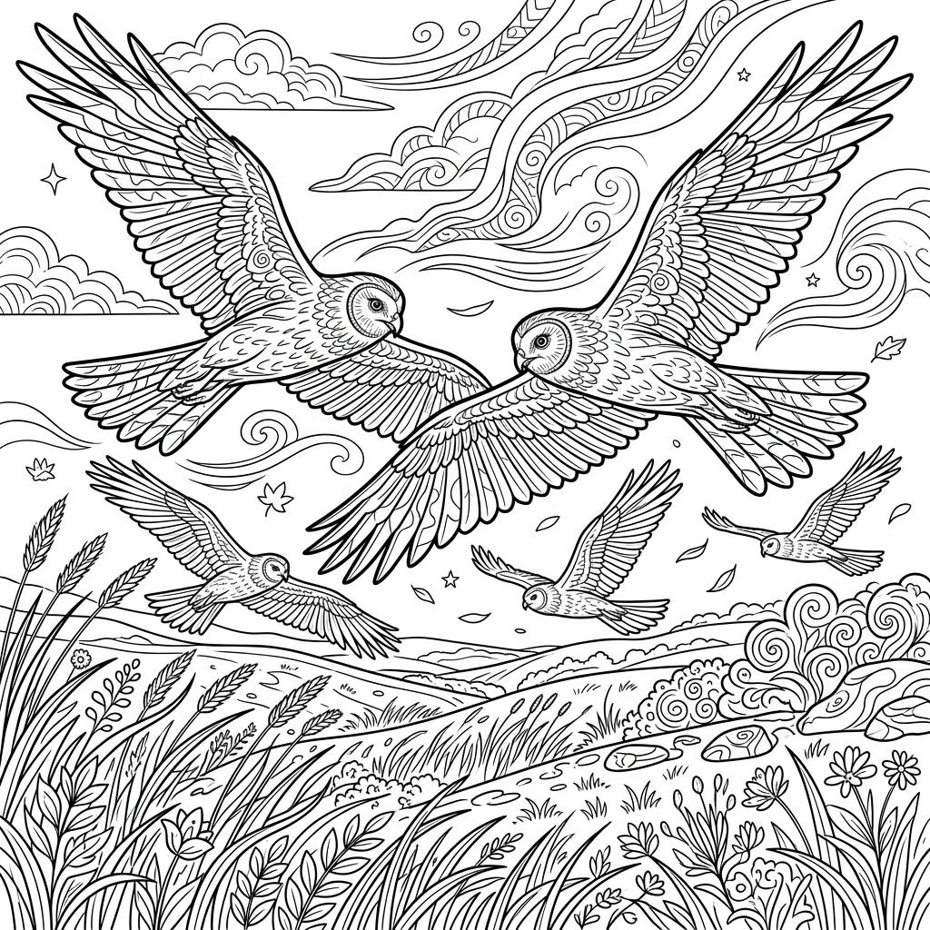 View coloring pageDiscover the serene beauty of harrier birds soaring through open skies with this engaging coloring page. Designed specifically for seniors, it offers clear lines and intricate details for a relaxing and rewarding creative experience.