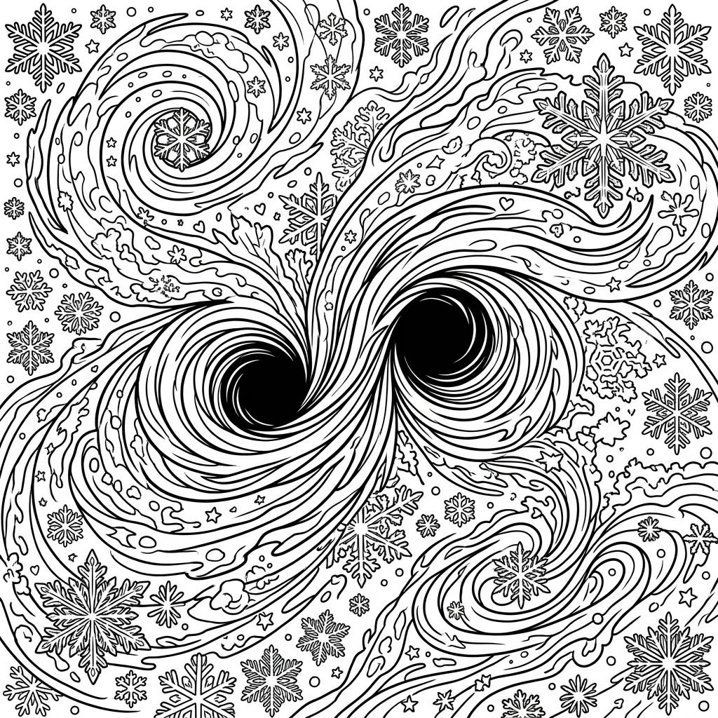 Journey to the edge of the universe with this extraordinary coloring page, blending the dramatic power of black hole mergers with the serene beauty of a winter wonderland. Swirling cosmic patterns meet intricate snowflakes, offering a mesmerizing canvas for your creativity.