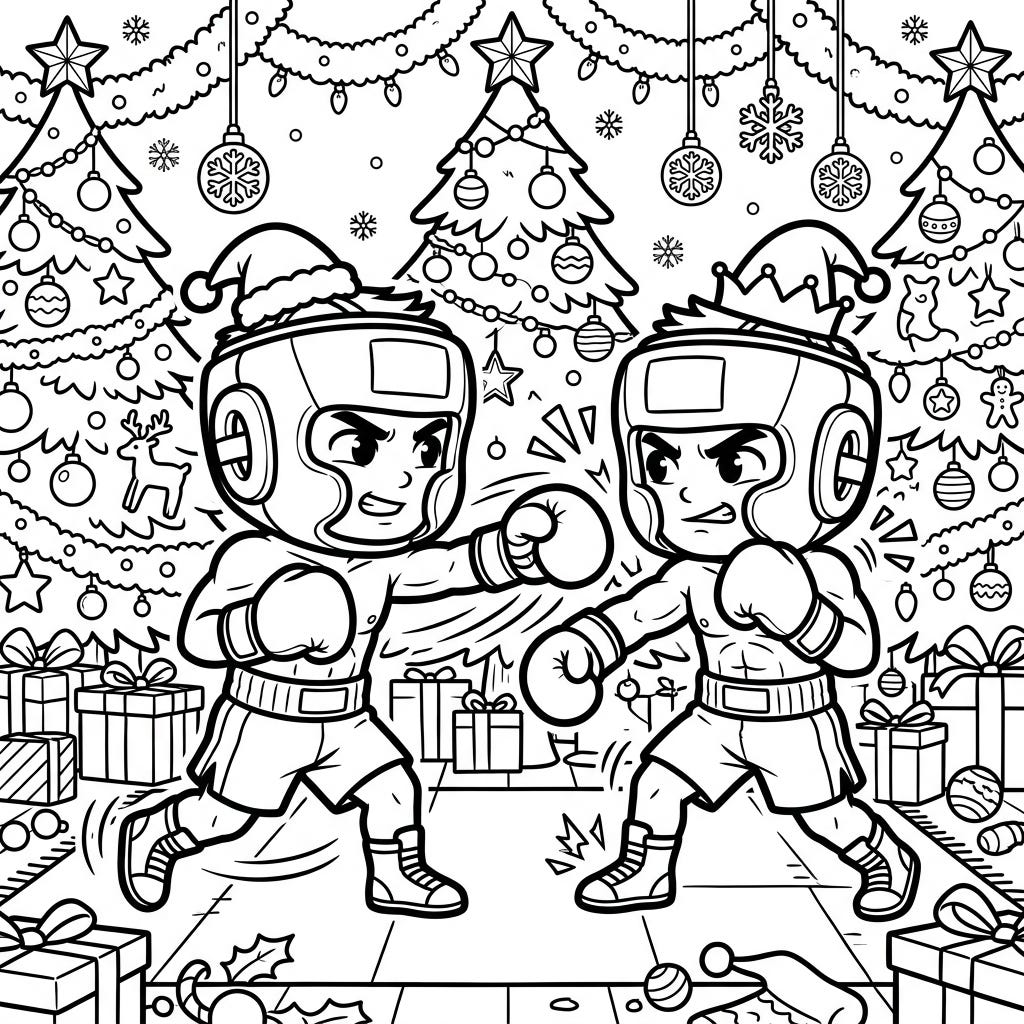 Gear up for a unique holiday challenge with this exciting Boxers Sparring Christmas coloring page! It features two spirited fighters in a festive ring, surrounded by joyful Christmas decorations, perfect for an engaging coloring session.