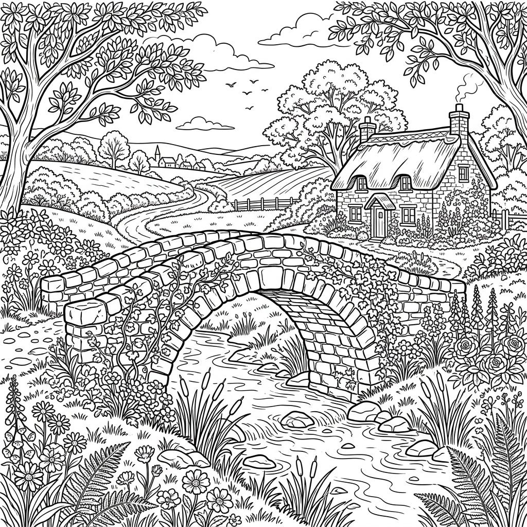 Discover the charm of a rustic arch bridge nestled in a picturesque cottagecore landscape. This delightful coloring page invites you to unwind and bring to life a tranquil rural scene filled with natural beauty.