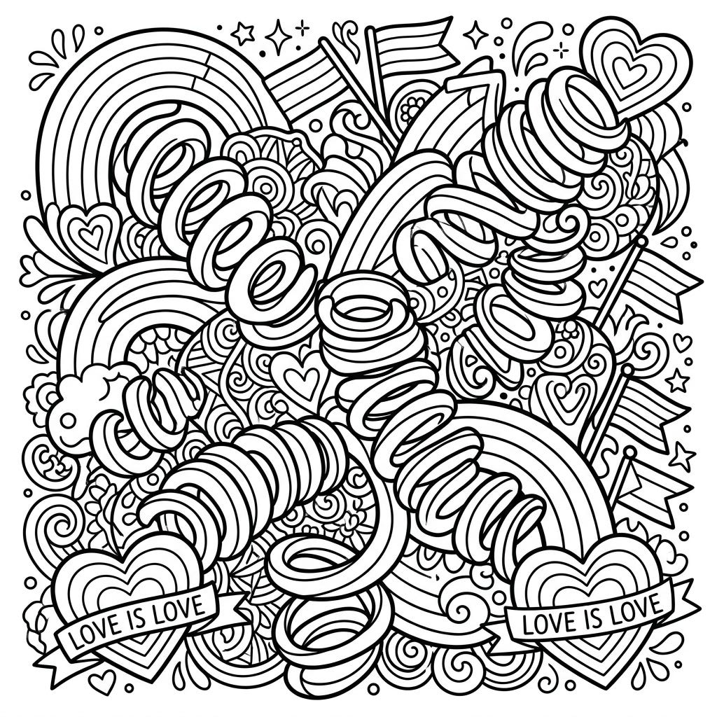 Get ready to celebrate with this unique coloring page featuring playful seasoned curly fries intertwined with vibrant Pride Month symbols. This fun design, complete with rainbows and 'Love is Love' hearts, offers a delightful way to express your creativity and show your support.