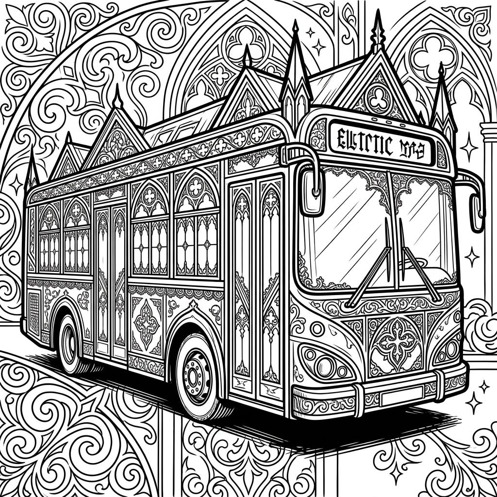 Discover a truly unique fusion with our Gothic Electric Bus coloring page. This intricate design blends modern transit with dark, ornate Victorian aesthetics for a captivating artistic experience.