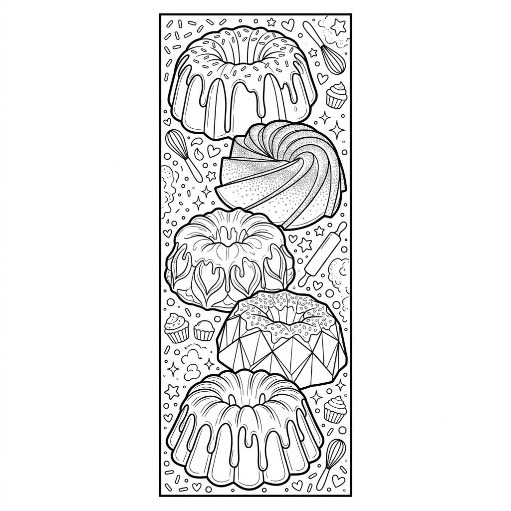 Delight in this unique Bundt cake bookmark coloring page, featuring a stack of beautifully detailed cakes ready for your creative touch. Perfect for adding a sweet flair to your favorite books, this printable is a joy for all ages.