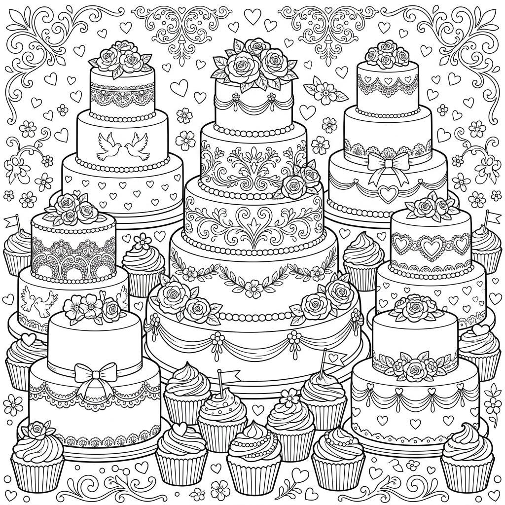 Dive into the delightful details of this wedding cakes coloring page, featuring an array of beautifully adorned tiered cakes and charming cupcakes. It's the perfect way to relax and unleash your creativity, bringing these romantic designs to life with your favorite colors.