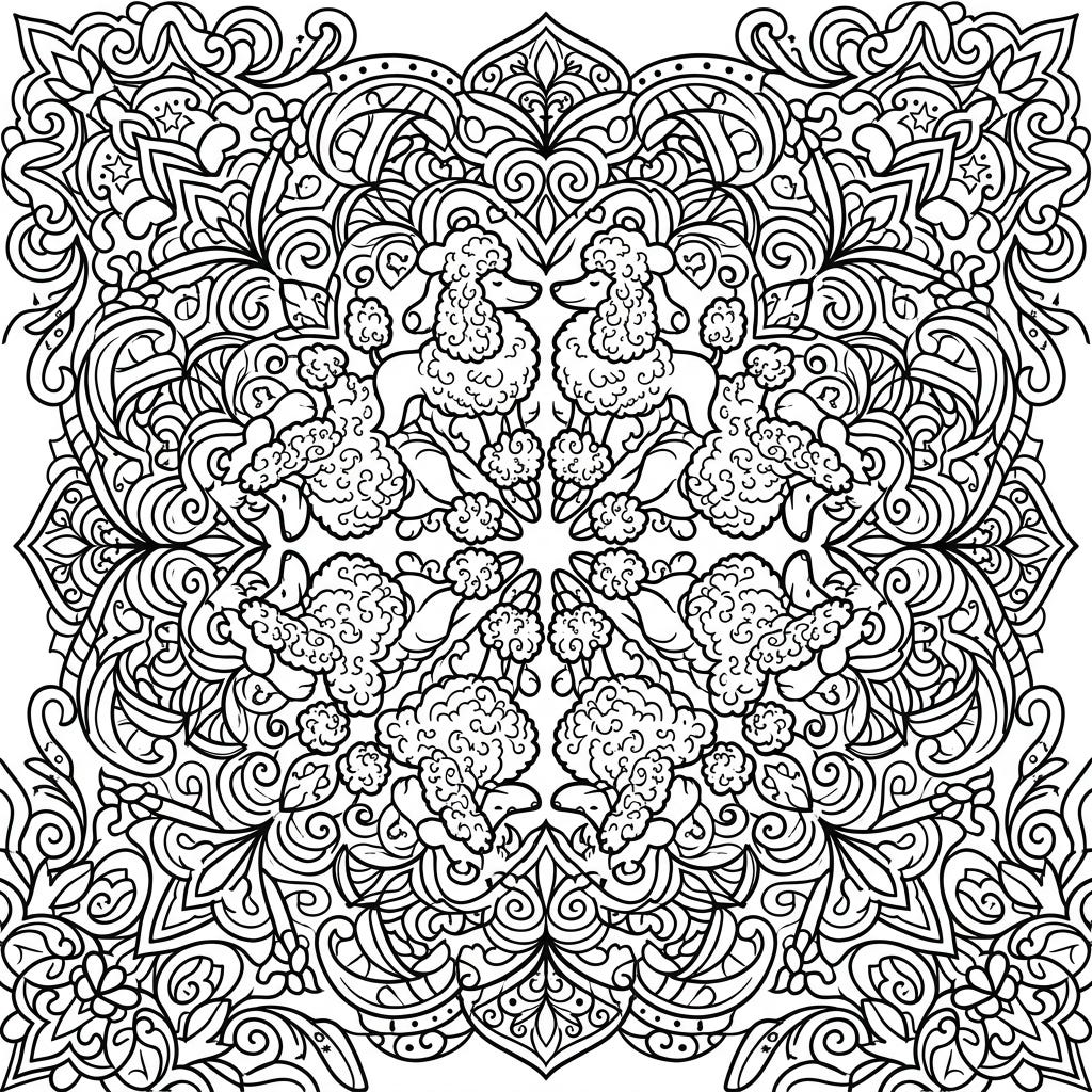 View coloring pageDive into tranquility with this stunning adult coloring page featuring elegant poodles intricately woven into a majestic mandala. Designed for mindfulness and relaxation, it offers a detailed artistic escape.