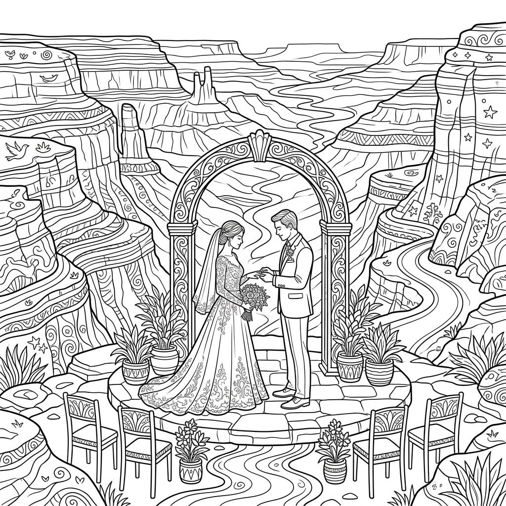 Witness a stunning wedding ceremony unfolding against the dramatic backdrop of a vast canyon overlook. This intricate coloring page captures the romance and grandeur of a special day.