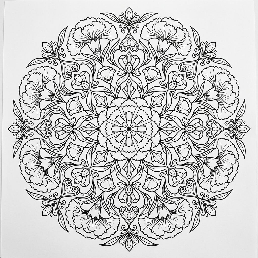Discover the exquisite detail of this red carnation mandala, a circular design brimming with floral elegance. Perfect for finding your creative flow and relaxation.