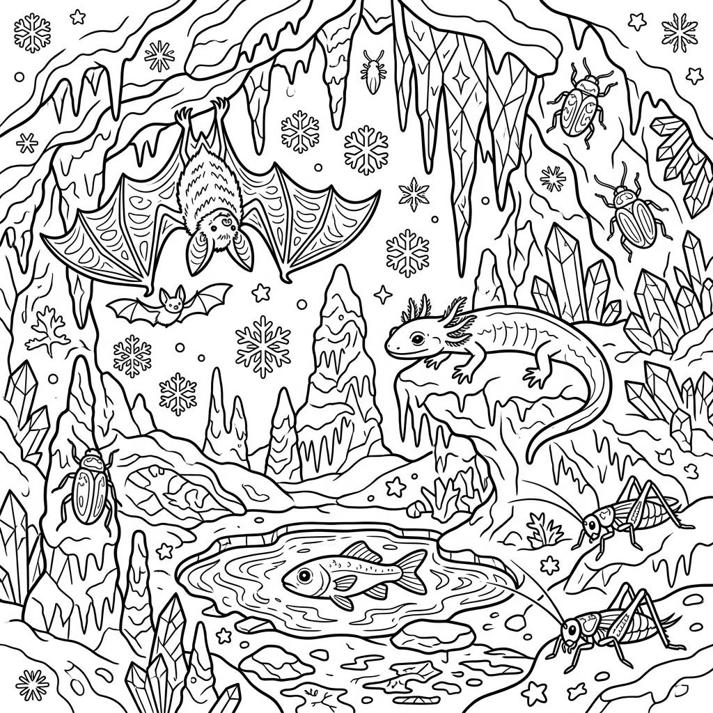 Dive into a unique winter wonderland with this captivating coloring page featuring fascinating cave fauna. Discover bats, axolotls, and insects thriving amidst icy crystal formations and delicate snowflakes, ready for your creative touch.