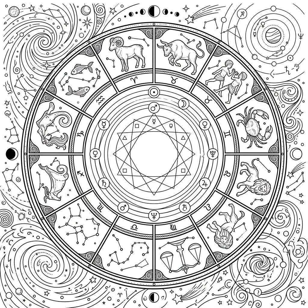 View coloring pageExplore the mystical world of the stars with our free Astrological Chart Patterns coloring pages. Discover intricate designs that represent celestial positions, perfect for a relaxing and creative activity.
