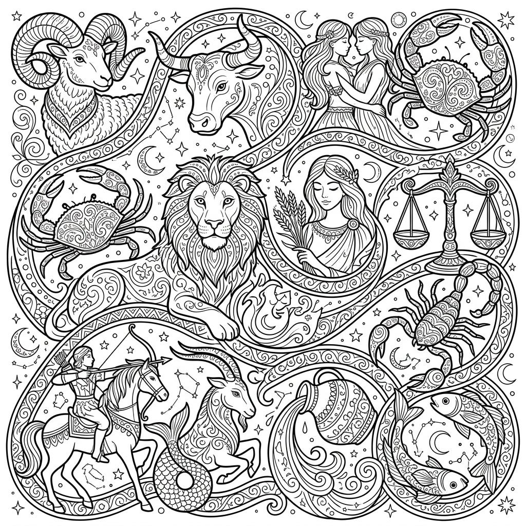 This detailed coloring page beautifully captures all twelve astrological zodiac signs, from Aries to Pisces, in an intricate design. Perfect for adults and teens, it offers a relaxing and engaging artistic journey through the cosmos.