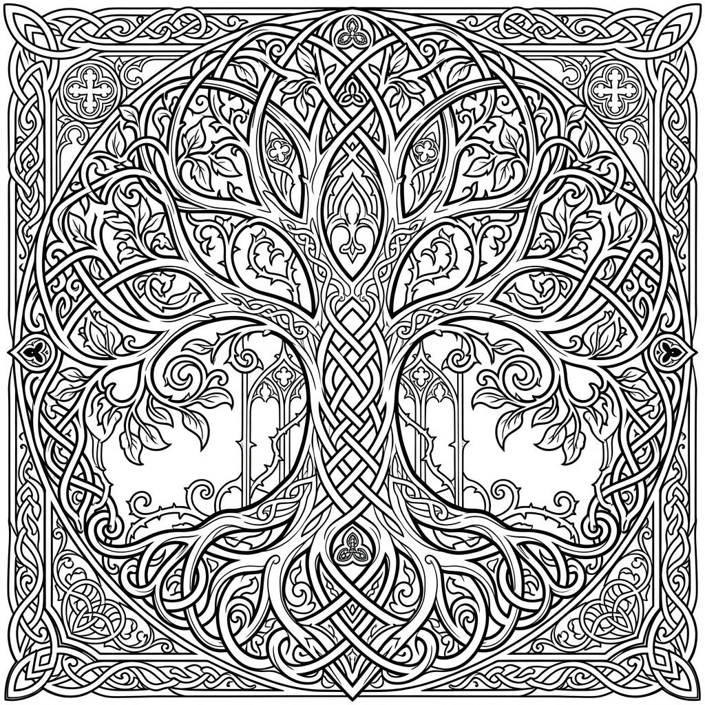 View coloring pageImmerse yourself in the dark elegance of this Gothic Celtic Tree Knots coloring page, where ancient symbolism meets intricate design. This detailed template captures the mystical essence of the Tree of Life, offering a uniquely satisfying coloring experience.