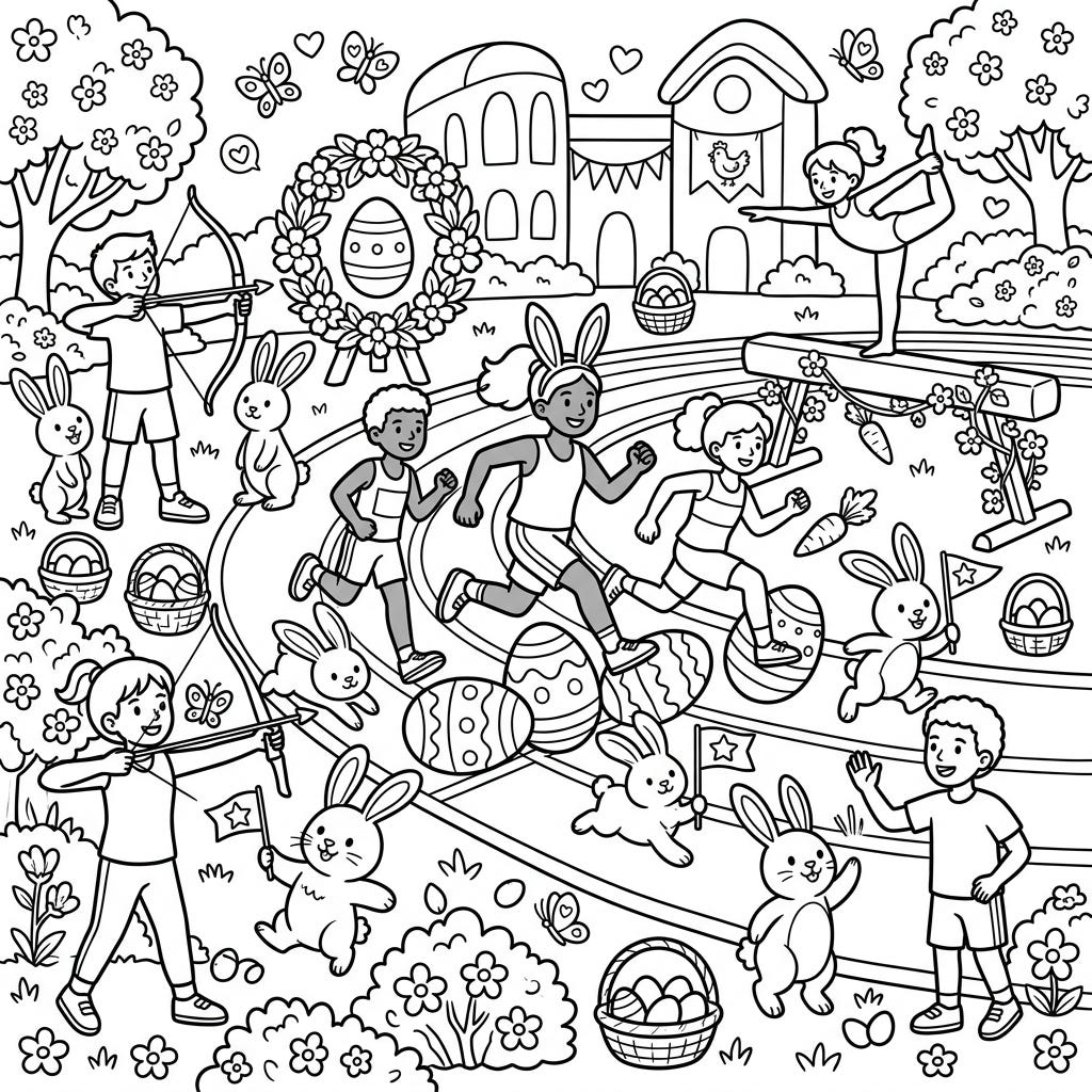 Experience a delightful fusion of athletic energy and Easter charm with this unique coloring page. Young athletes are depicted enjoying various sports alongside playful bunnies and colorful eggs, offering hours of creative fun.