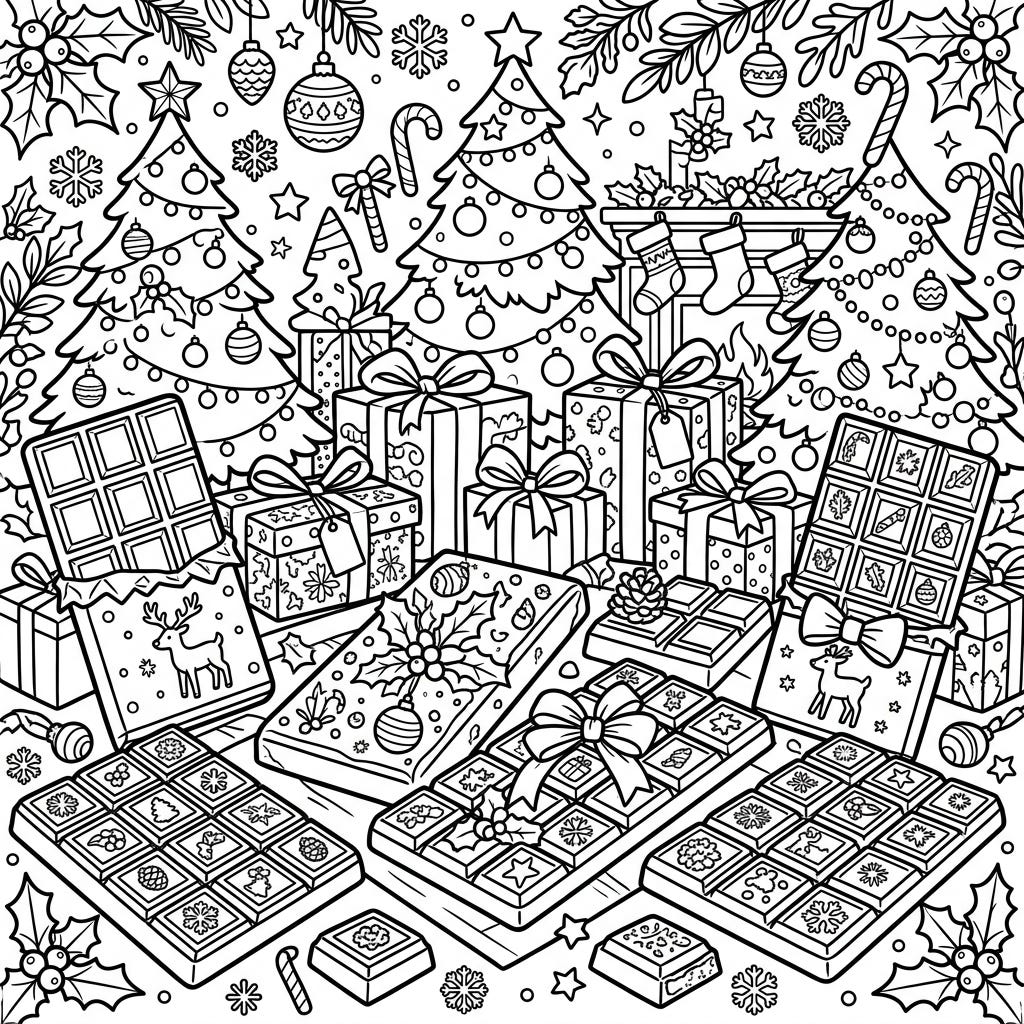 Get into the holiday spirit with this delightful coloring page featuring an abundance of Christmas chocolate bars. Discover a festive scene filled with sweet treats, holiday gifts, and cheerful decorations, perfect for a cozy coloring session.
