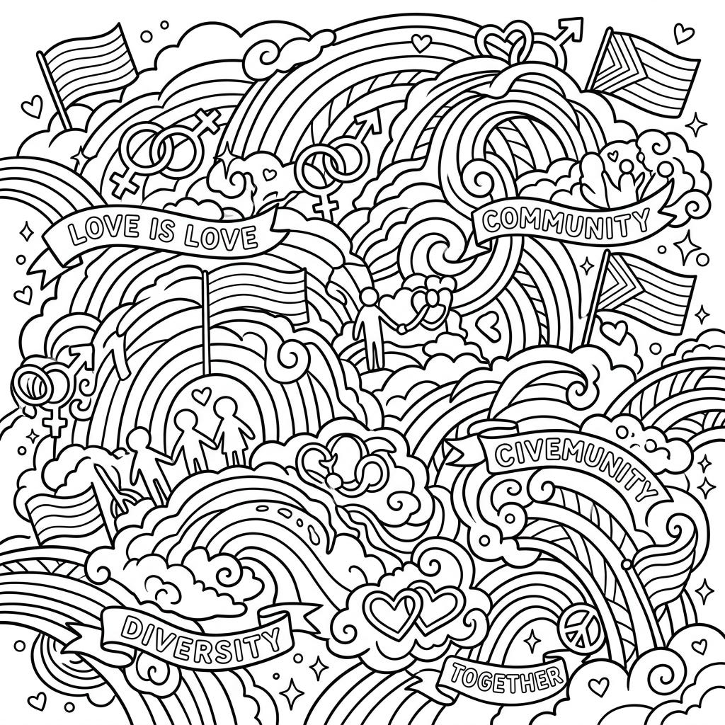 Dive into a unique celebration of Pride Month with this intricate coloring page featuring nimbostratus clouds swirling with symbols of love and diversity. Perfect for expressing unity and creativity, this design invites you to fill its detailed lines with the vibrant colors of the rainbow.