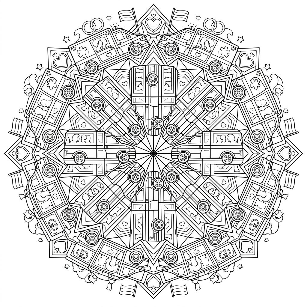 This unique coloring page beautifully combines the essential service of ambulances with the vibrant spirit of Pride Month in an intricate mandala design. Discover a detailed pattern that invites you to celebrate diversity, care, and community through your artistic expression.