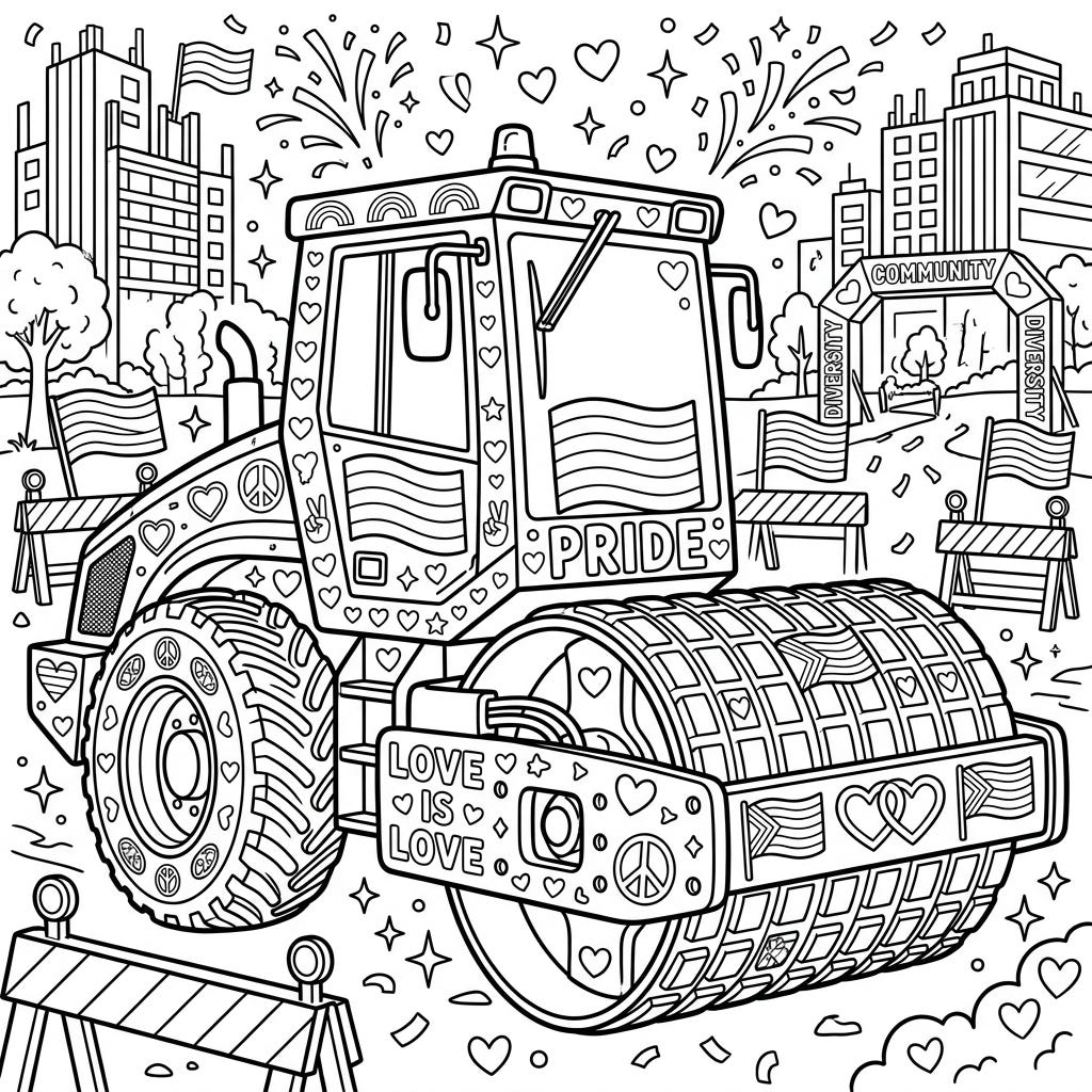 Get ready to color a unique celebration of Pride Month with our festive compactor and roller coloring page. This design brings together the power of heavy machinery with symbols of love, diversity, and community for a truly special artistic experience.
