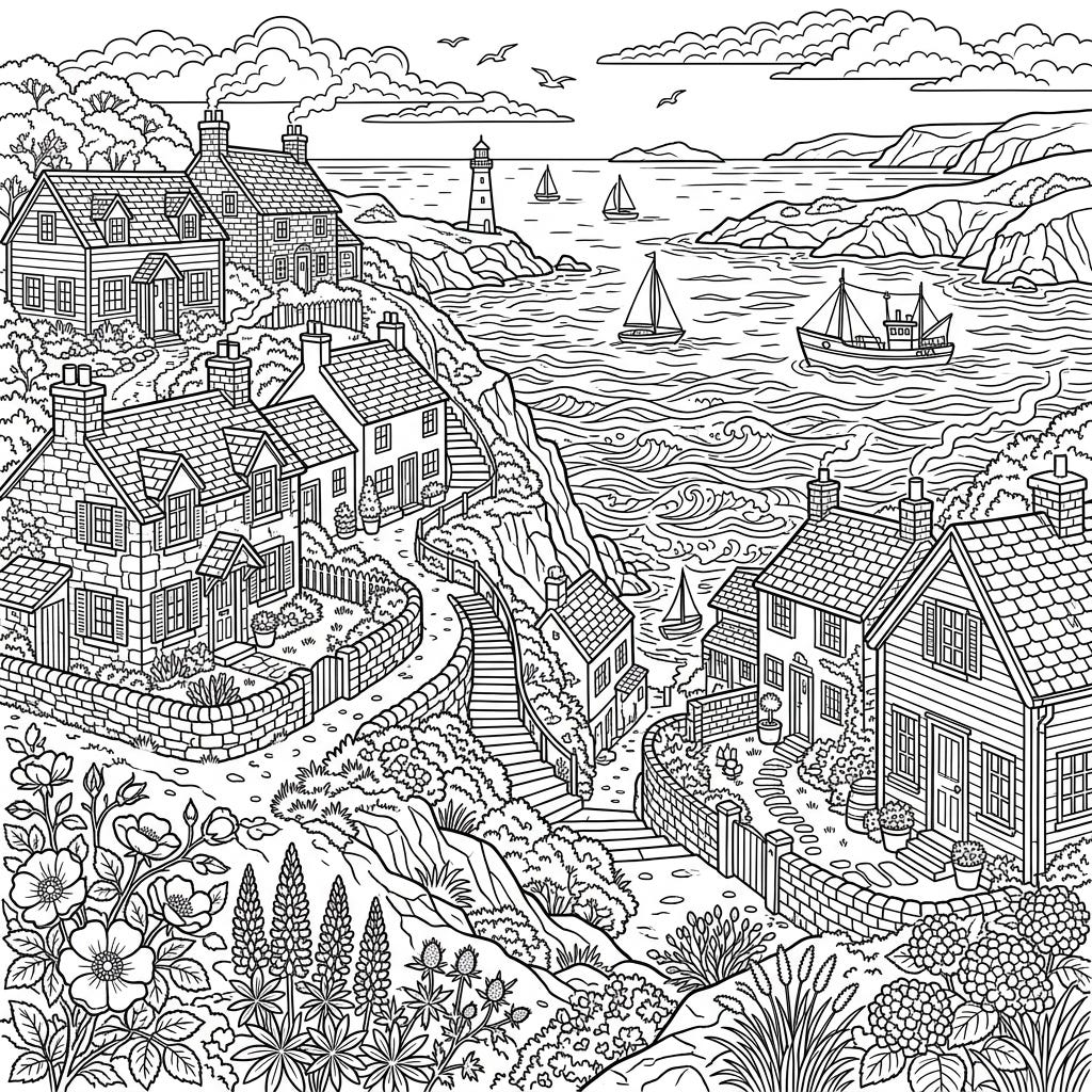 Dive into the charm of a picturesque coastal village with this detailed coloring page, perfect for teens. Featuring quaint cottages nestled along a winding seaside path, it offers an engaging creative escape.