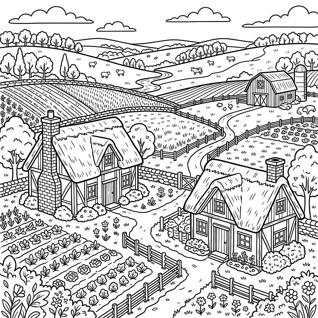 Step into a peaceful countryside scene with this delightful farm cottages coloring page, specially designed for seniors. Its clear lines and engaging details offer a relaxing and accessible creative experience.