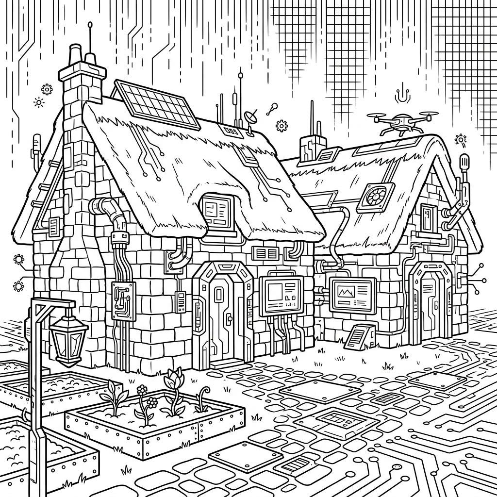 Discover a unique blend of old-world charm and futuristic tech with this captivating coloring page. A traditional stone cottage is reimagined with intricate cyberpunk elements, offering a truly original artistic experience for colorists.