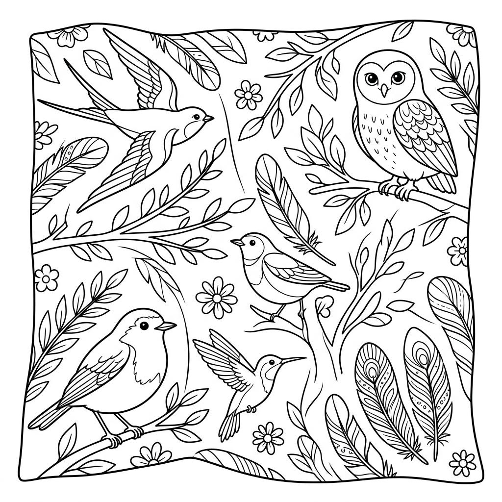 Bring the beauty of nature to life with this charming coloring page, specially designed for kids! Featuring an adorable collection of birds, feathers, and forest elements, it offers hours of creative fun.