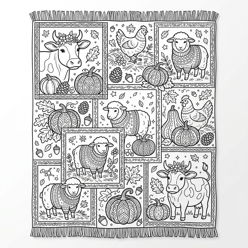 Embrace the warmth of fall with this delightful coloring page, depicting a cozy blanket adorned with charming farm animals and autumnal bounty. Discover adorable sheep in sweaters, friendly cows, and lively chickens amidst pumpkins and falling leaves, ready for your creative touch.