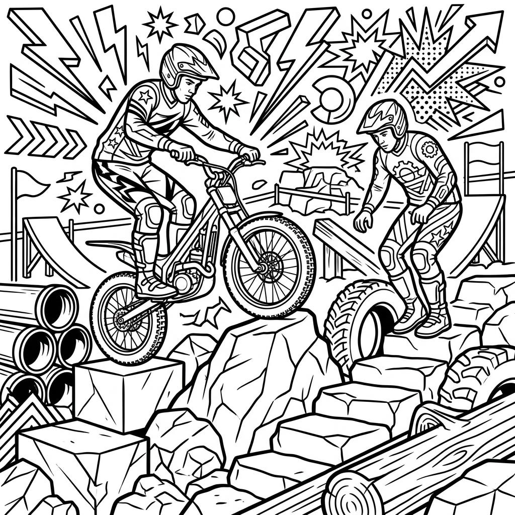 Gear up for an exciting coloring adventure with our Pop Art Trials Riders design, featuring daring athletes mastering challenging obstacles. This vibrant template blends extreme sports action with a bold artistic style, perfect for unleashing your inner artist.