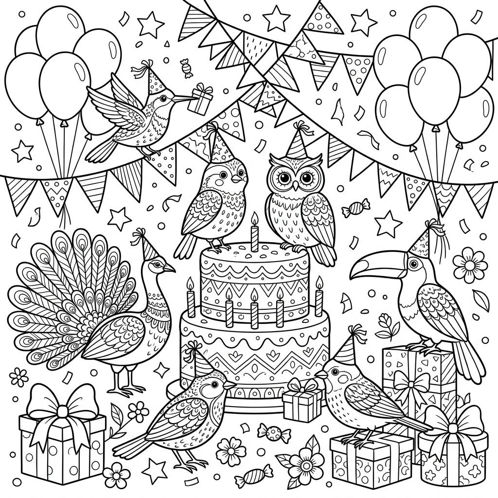 Join a charming flock of bird figurines as they celebrate a whimsical birthday party! This delightful coloring page is packed with festive details, including a grand cake, wrapped presents, balloons, and confetti, ready for your creative touch.