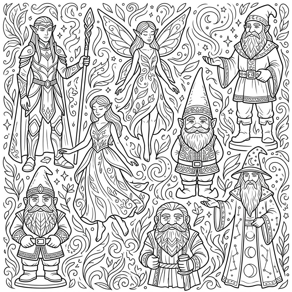 Step into a realm of magic with our Fantasy Character Statues coloring page, featuring majestic elves, graceful fairies, and charming gnomes. This detailed line art invites you to bring these mythical beings to life with your favorite colors.
