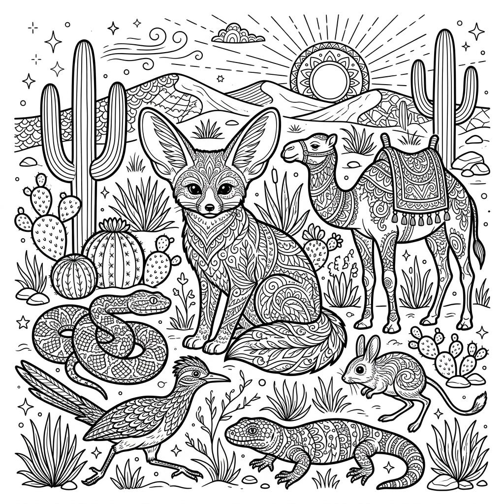 Immerse yourself in the beauty of desert wildlife with this captivating Zentangle coloring page. Discover a fennec fox, camel, snake, and more, all adorned with mesmerizing patterns, ready for your artistic touch.