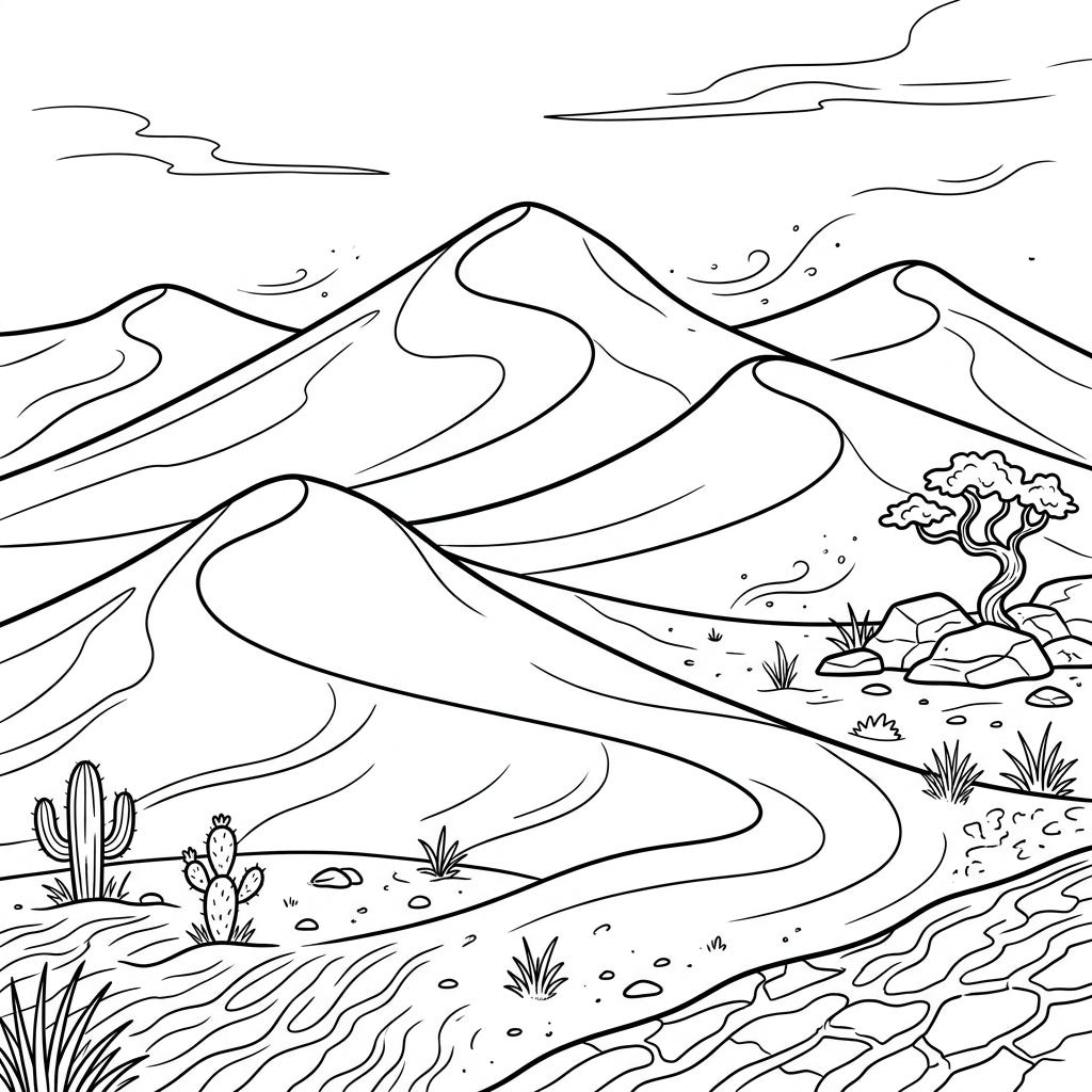 View coloring pageJourney into the heart of the desert with this stunning Sand Dunes coloring page, perfect for all ages. Unleash your creativity as you bring these iconic landscapes and desert flora to life with vibrant colors.