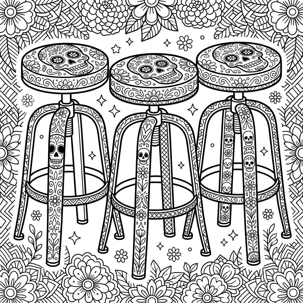 Dive into the festive spirit of Dia de los Muertos with this uniquely designed coloring page featuring ornate bar stools. Each stool is intricately adorned with traditional sugar skulls, marigolds, and rich patterns, offering a captivating artistic challenge.