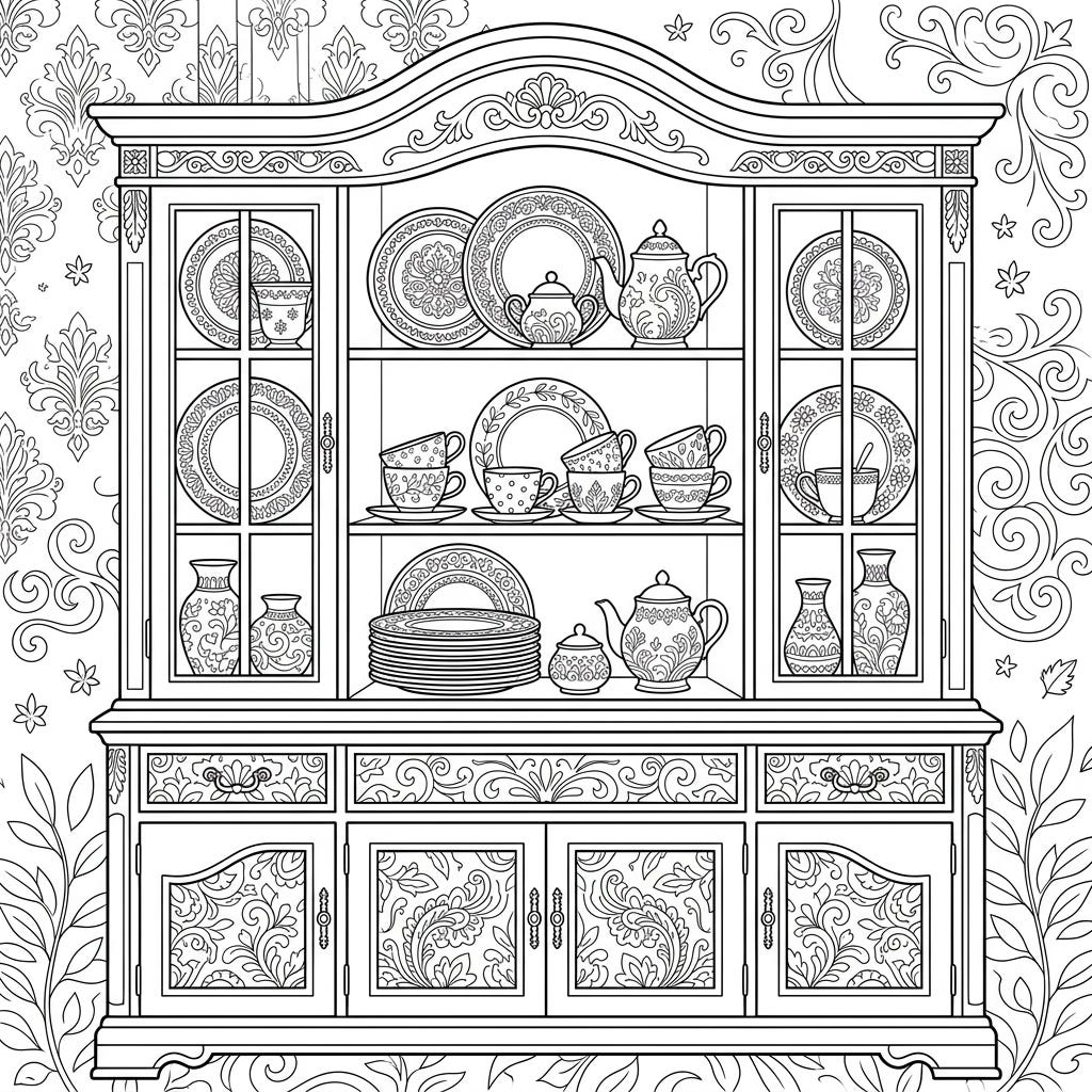 Discover this beautifully intricate coloring page featuring a grand china cabinet. Filled with ornate dinnerware and decorative elements, it promises a rich and rewarding coloring experience.
