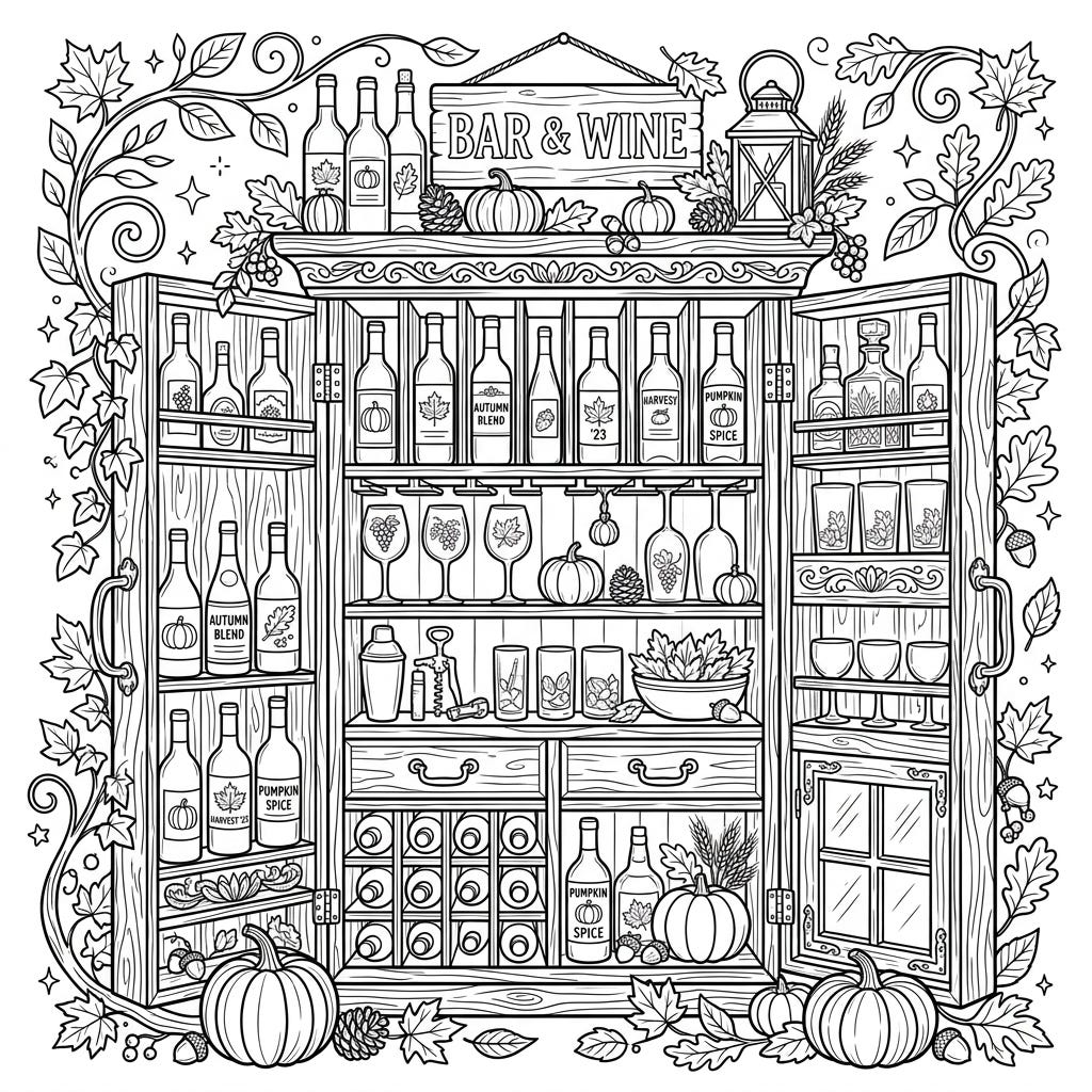 Dive into the heartwarming spirit of autumn with this beautifully detailed wine bar cabinet coloring page. Adorned with harvest elements, it offers a sophisticated and engaging artistic challenge for adults and teens.