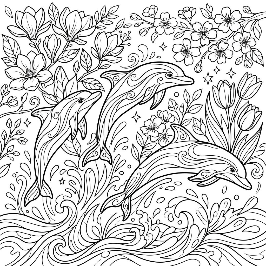 Celebrate the vibrant energy of spring with this captivating coloring page featuring three playful dolphins. Watch them leap gracefully from the ocean waves, surrounded by a lush tapestry of blooming flowers.
