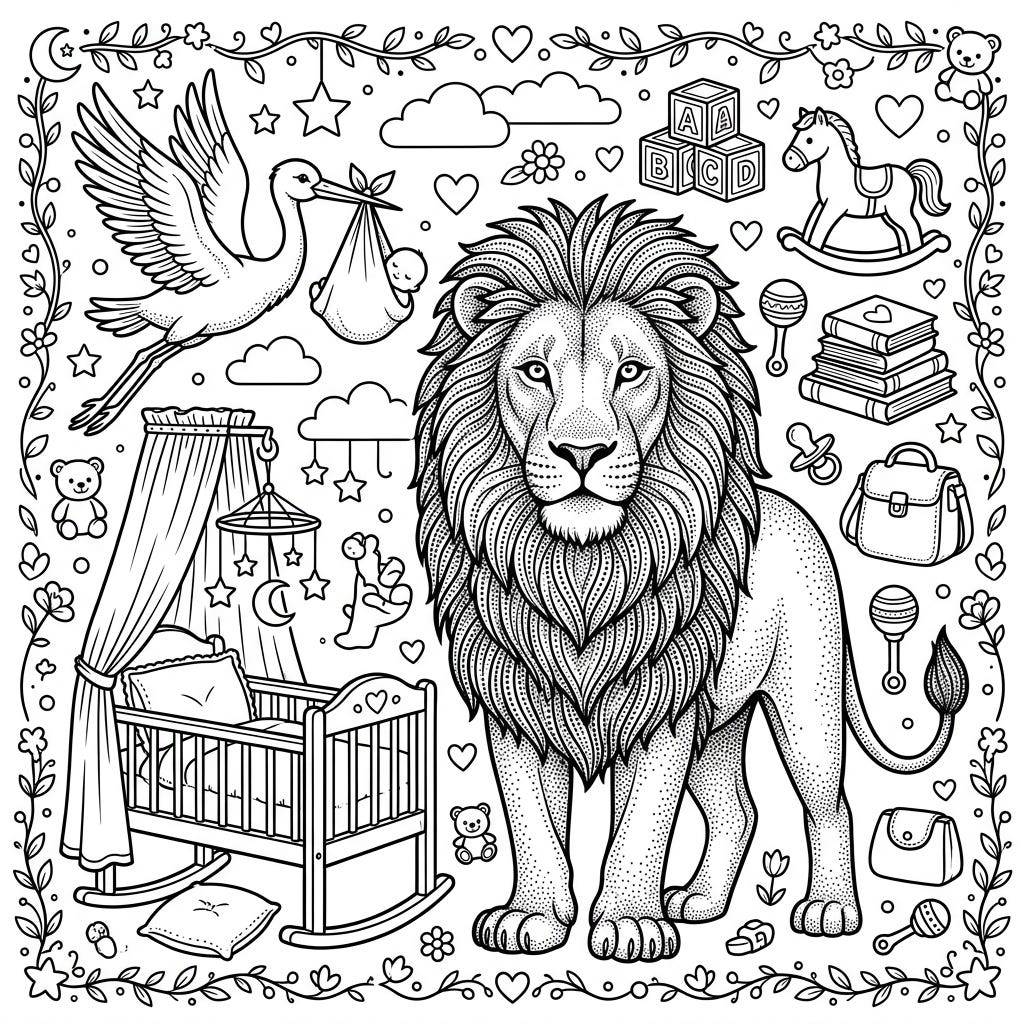 Discover the perfect blend of majestic wildlife and tender new beginnings with this unique Dot Work Lion Baby Shower coloring page. This intricate design offers a creative way to celebrate upcoming arrivals, featuring a beautifully detailed lion surrounded by adorable nursery items.
