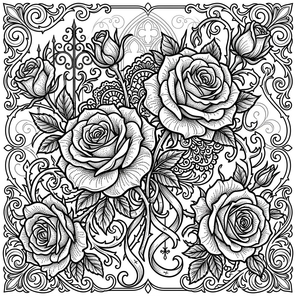 View coloring pageExplore the captivating elegance of our Gothic Dot Work Rose coloring page, featuring richly detailed roses adorned with delicate stippling. Immerse yourself in a world of ornate vines and intricate lace, perfect for an advanced coloring experience.