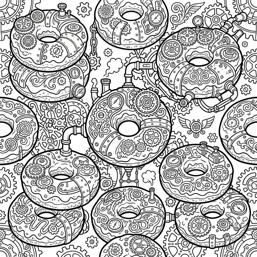Dive into a unique world where delicious cake doughnuts get a fantastical Steampunk makeover. This intricate coloring page invites you to bring industrial Victorian charm to life with your favorite colors.