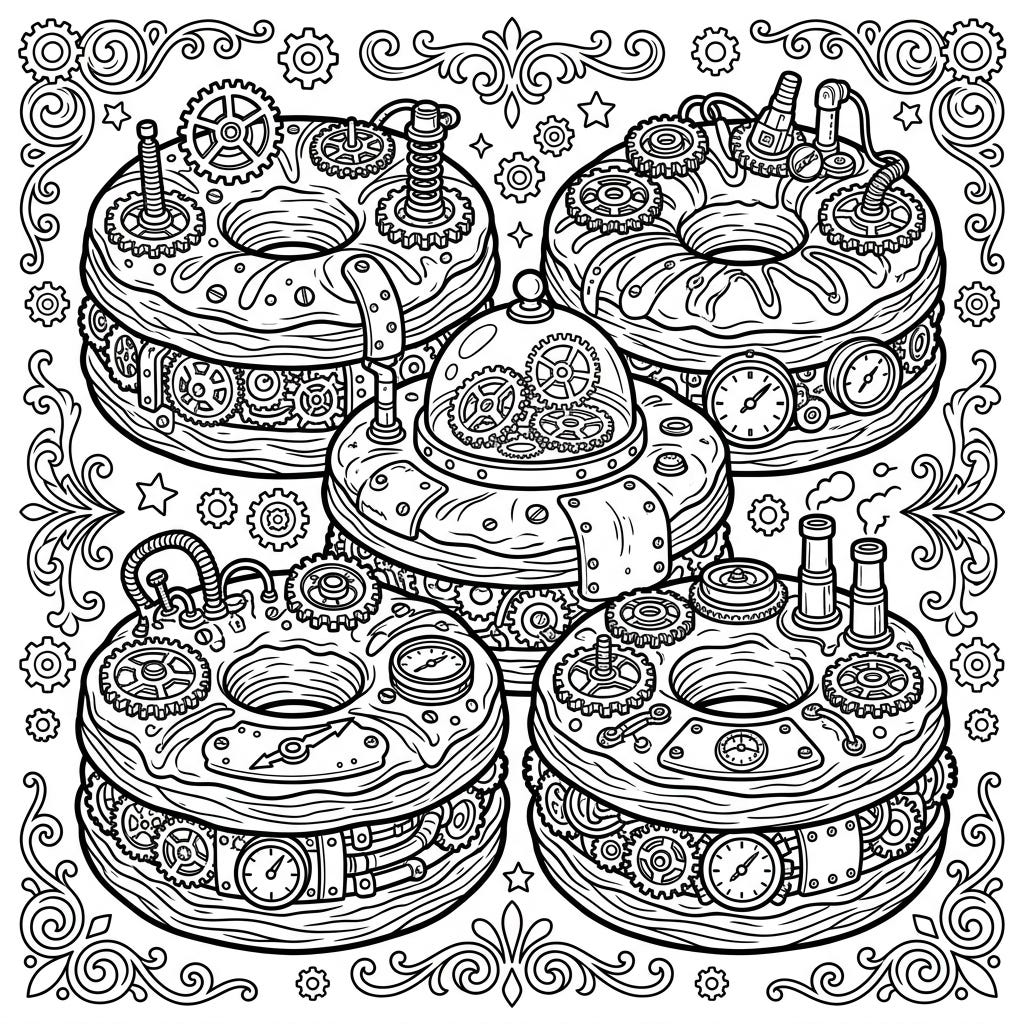 Embark on a culinary and mechanical coloring journey with these unique Steampunk Cronuts, intricately adorned with gears, pipes, and Victorian charm. This creative design offers a challenging yet rewarding experience for colorists of all levels.